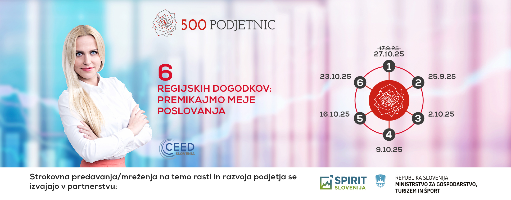 Prireditev 500 podjetnic že več kot desetletje povezuje, navdihuje in spodbuja podjetnice k osebni in poslovni rasti, predstavlja in promovira njihove dejavnosti in stremi k mednarodnemu povezovanju podjetnic. Pred osrednjim dogodkom v letu 2026 pripravljamo 6 regijskih srečanj podjetnic pod skupnim sloganom Premikajmo meje poslovanja, ki ponujajo: